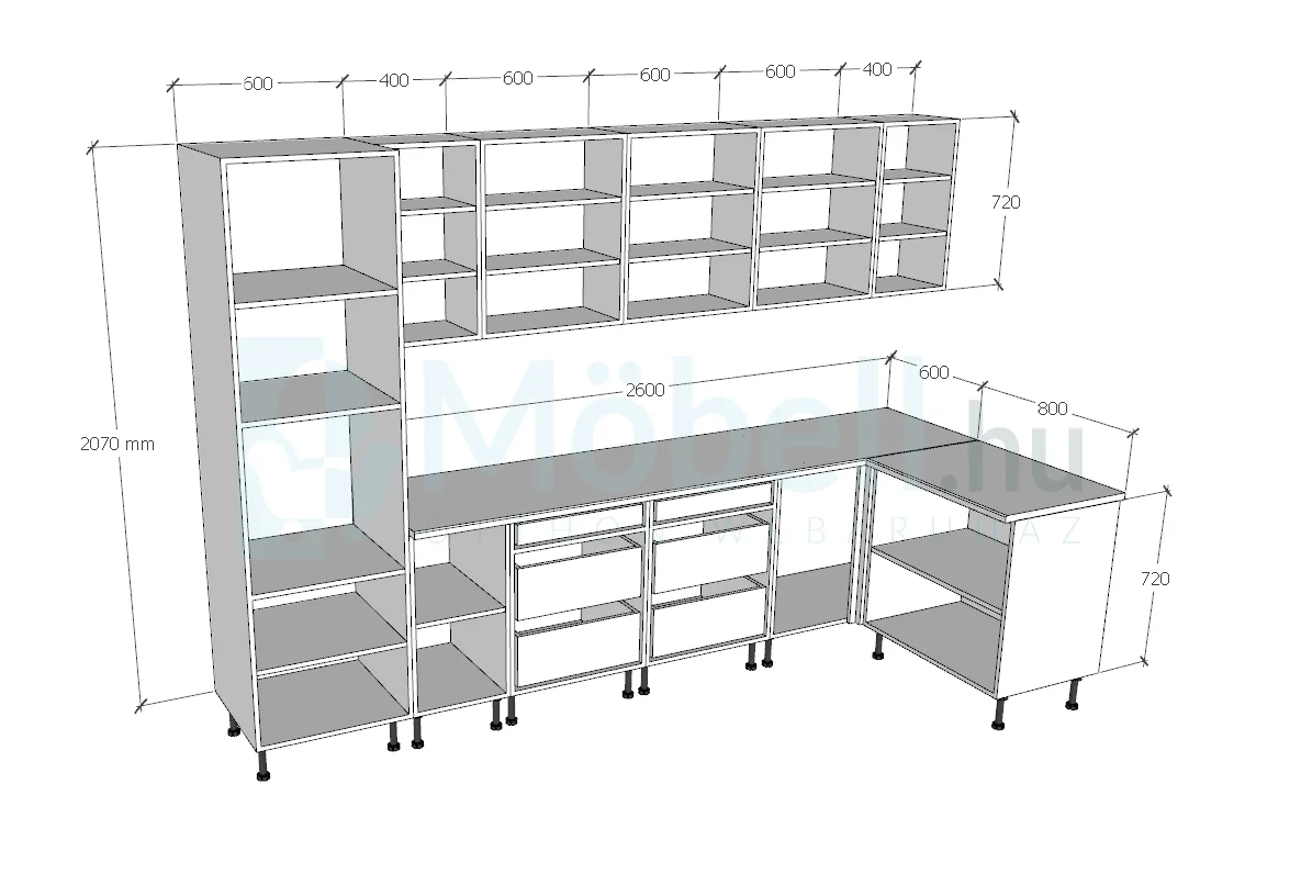 Az elemek mérete a termékleírásnál található. Amennyiben a konyhasort ki szeretné még pluszban elemekkel egészíteni, az itt található elem kínálatból választhat.
