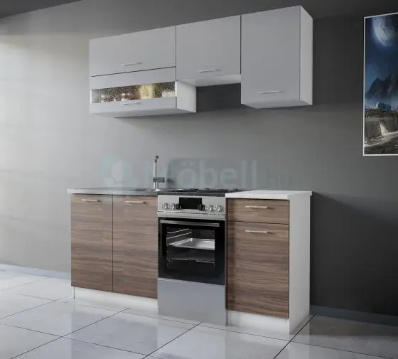 A Duna Oliva - Ezüst konyhabútor 170 cm széles modern elrendezésű blokk konyhabútor. Ajtós fiókos üveges elemekkel kombinálva.