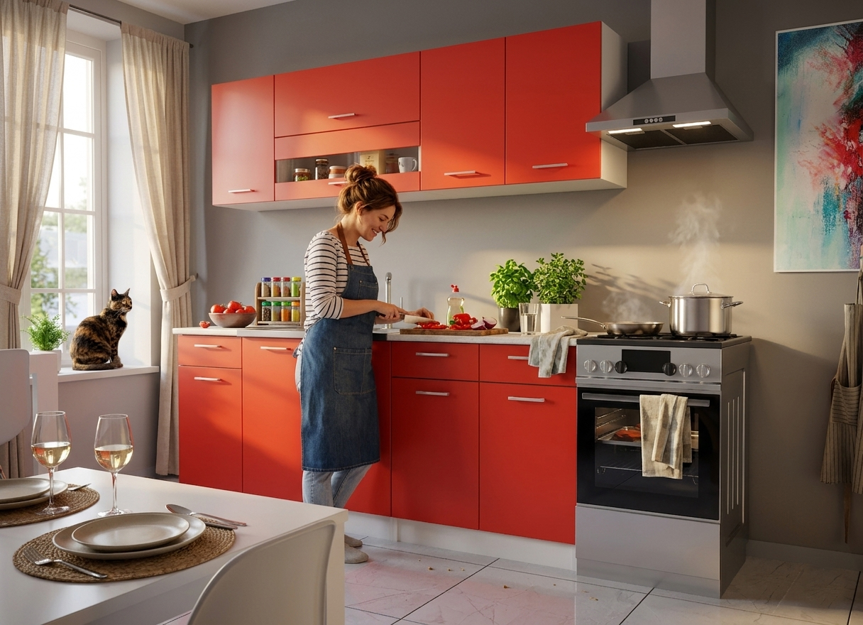 A kiegészítőknél, így például a tányérok, poharak, asztalterítő, kuka, hűtő, kenyérpirító esetében próbáljuk meg egyensúlyra törekedni. Mindenben elhelyezhetünk egy leheletnyi piros színt. Ha minden a helyére került és a konyha megfelel, sőt felülmúlja elképzeléseinket, nekünk nincs más dolgunk, csak az, hogy élvezzük ki az új környezetünk.