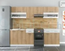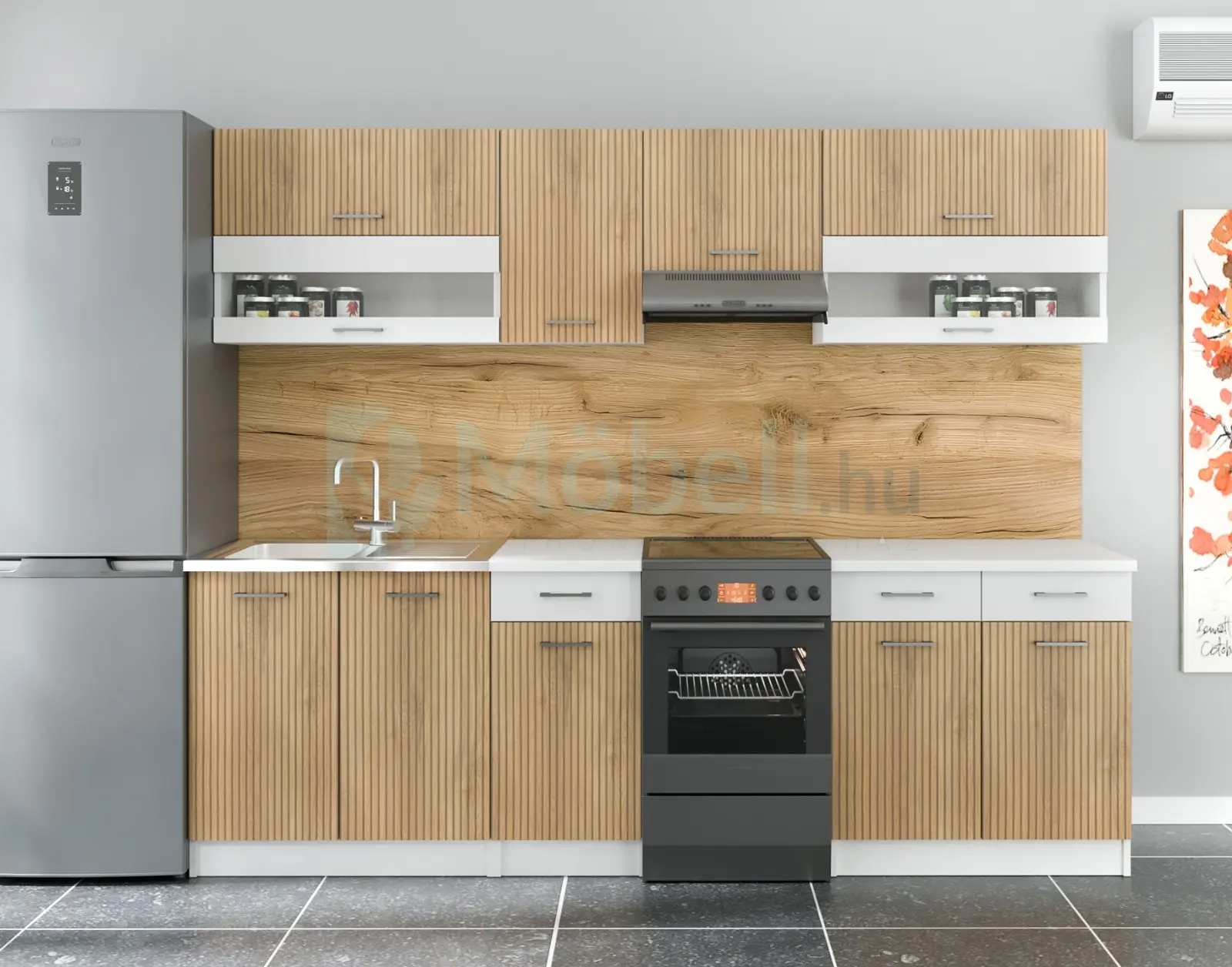 A Korfu konyhabútor 250 cm széles modern elrendezésű blokk konyhabútor. Ajtós fiókos üveges elemekkel kombinálva.