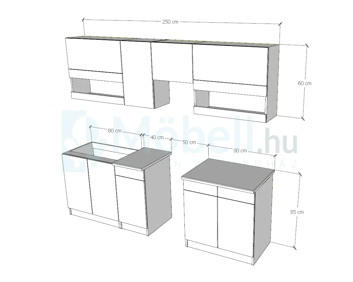 Az elemek mérete a termékleírásnál található. Amennyiben a konyhasort ki szeretné még pluszban elemekkel egészíteni, az itt található elem kínálatból választhat.