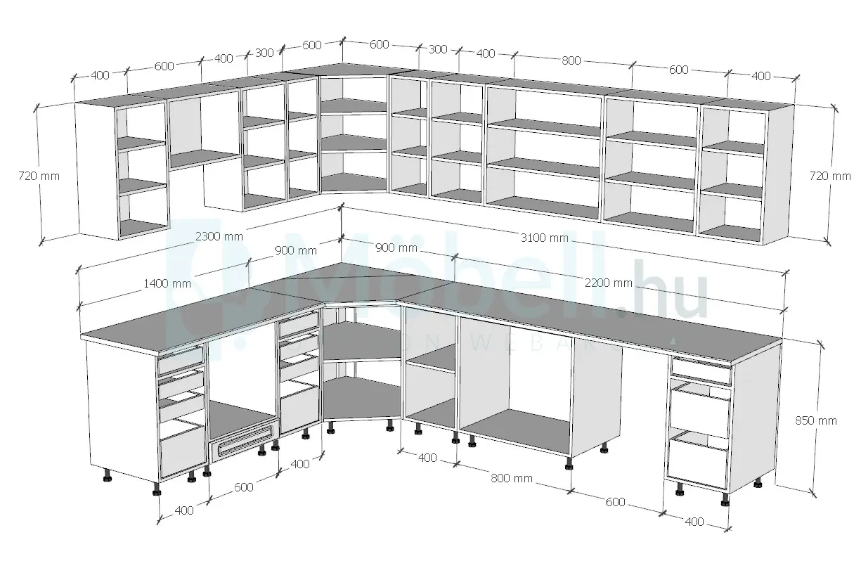 Az elemek mérete a termékleírásnál található. Amennyiben a konyhasort ki szeretné még pluszban elemekkel egészíteni, az itt található elem kínálatból választhat.